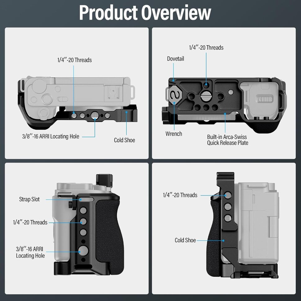 Клетка предлагает несколько вариантов крепления благодаря многочисленным резьбовым отверстиям 1/4" и ARRI 3/8". Это позволяет установить верхнюю ручку для съемки под низким углом. Кроме того, клетка оснащена встроенными холодными башмаками, которые позволяют добавить внешний микрофон, осветитель или монитор |