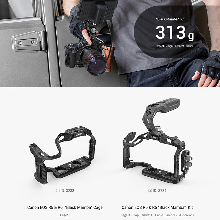Профессиональный комплект, состоящий из клетки, верхней рукоятки и специального зажима для кабеля. Предназначен для камер Canon EOS R5/R5C/R6. Ключевой особенностью представленной конструкции является свободный доступ ко всем функциям камеры, в том числе батарейному отсеку, а зажим легко можно переставить для R5 или R6 |