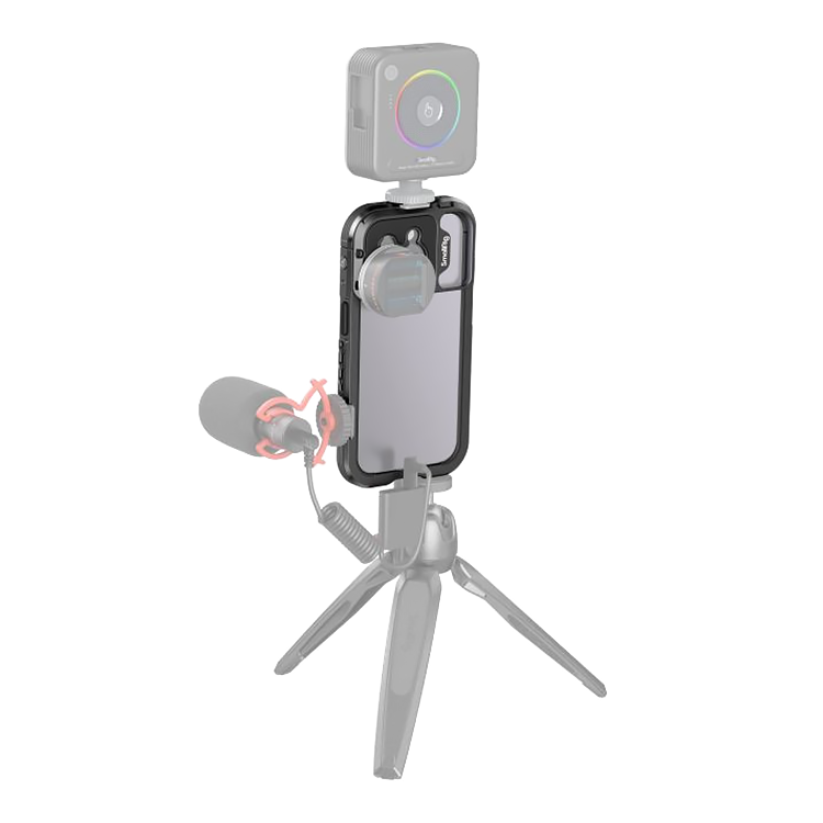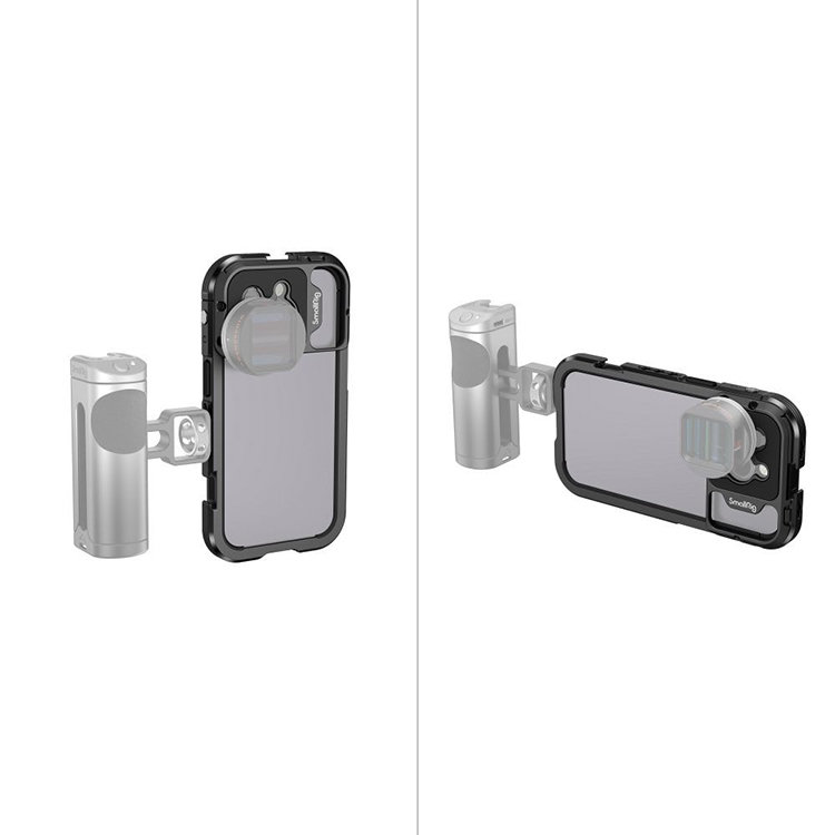 Клетка для профессиональной съёмки на смартфон. Имеет байонет стандарта Sirui/Moment для установки соответствующей мобильной оптики. Аксессуар не сковывает доступ к органам управления и зарядному порту, не мешает беспроводной зарядке и MagSafe |