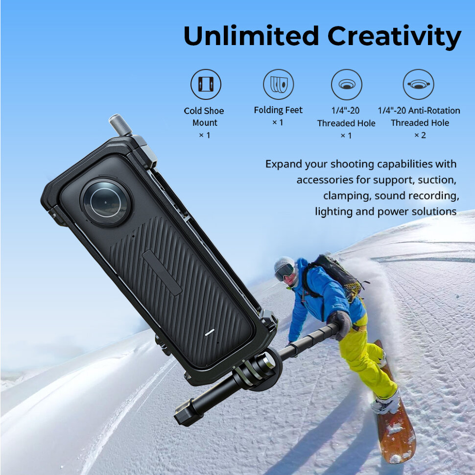 Клетка для Insta360 X4 обеспечивает надежную защиту и улучшенную функциональность вашей камеры. Изготовленная из высококачественного алюминиевого сплава, эта легкая и прочная клетка оснащена множеством резьбовых отверстий 1/4" и холодным башмаком, что позволяет легко крепить различные аксессуары, такие как микрофоны, осветители и рукоятки |