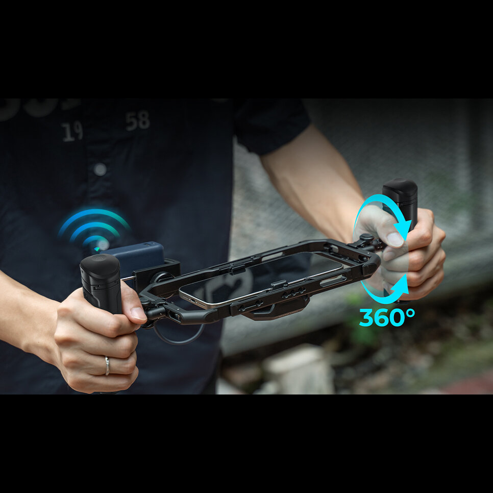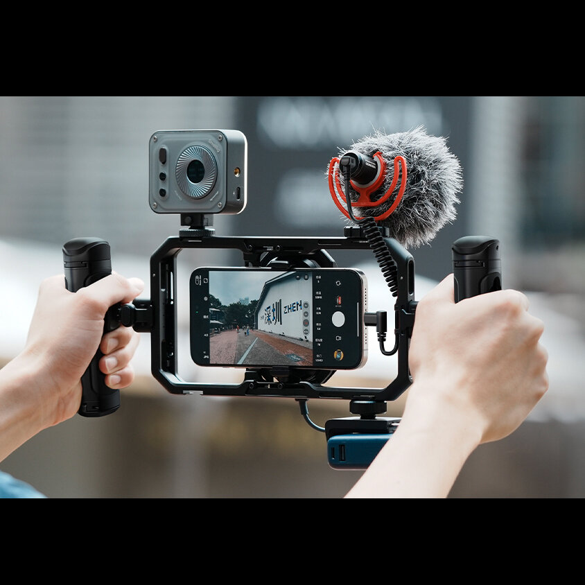 Эргономика и оперативность съемкиКомплект открывает возможность по сборке своего рига с осветителем и внешним микрофоном. Подключить дополнительное оснащение можно посредством Type-C хаба. Две боковые рукоятки со свободным вращением позволяют настроить удобный угол наклона, а на одной из них предусмотрена дистанционная кнопка старта записи. При помощи отдельного держателя в систему можно добавить компактный power bank для автономности |