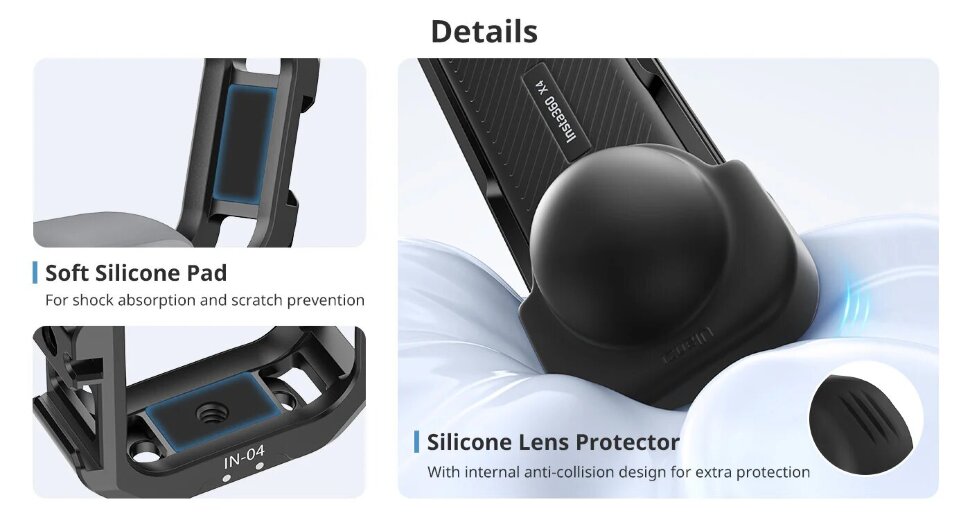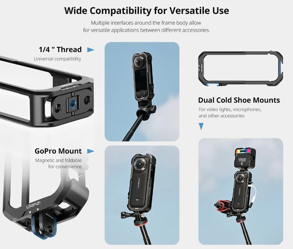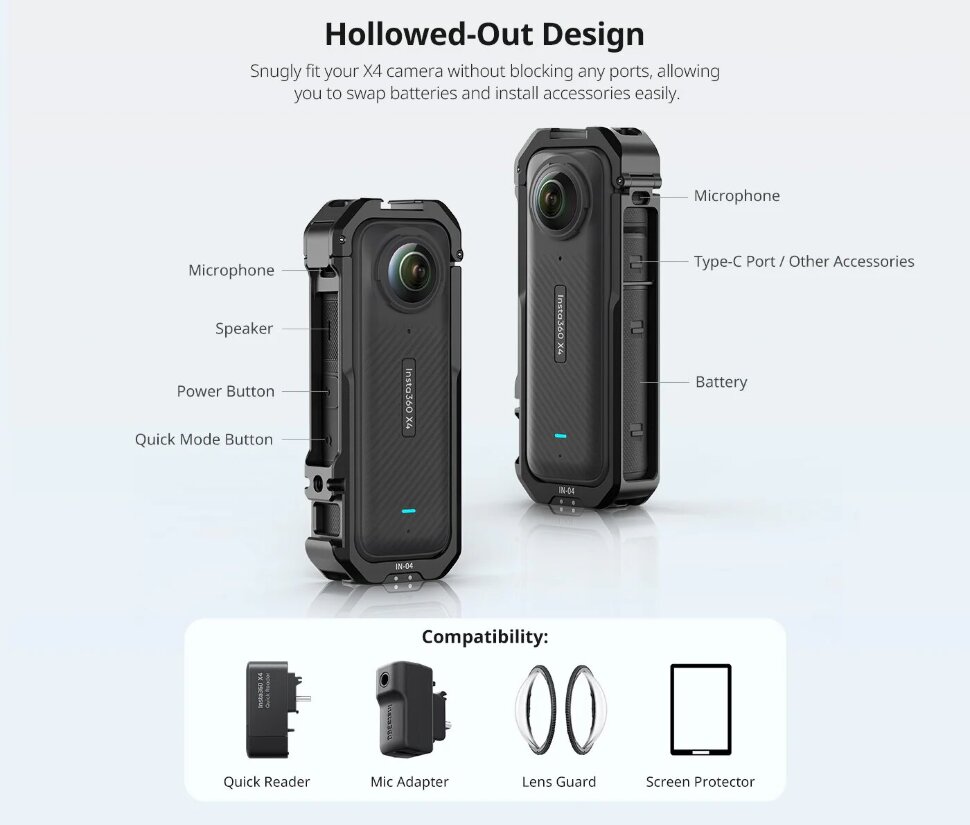 Полная защита для Insta360 X4Клетка обеспечивает надежную защиту вашей камеры благодаря прочной конструкции из алюминиевого сплава. В конструкции предусмотрены универсальные резьбовые отверстия 1/4", крепление для GoPro и холодный башмак, что делает модель отличным выбором для установки осветителей, микрофонов и других аксессуаров |