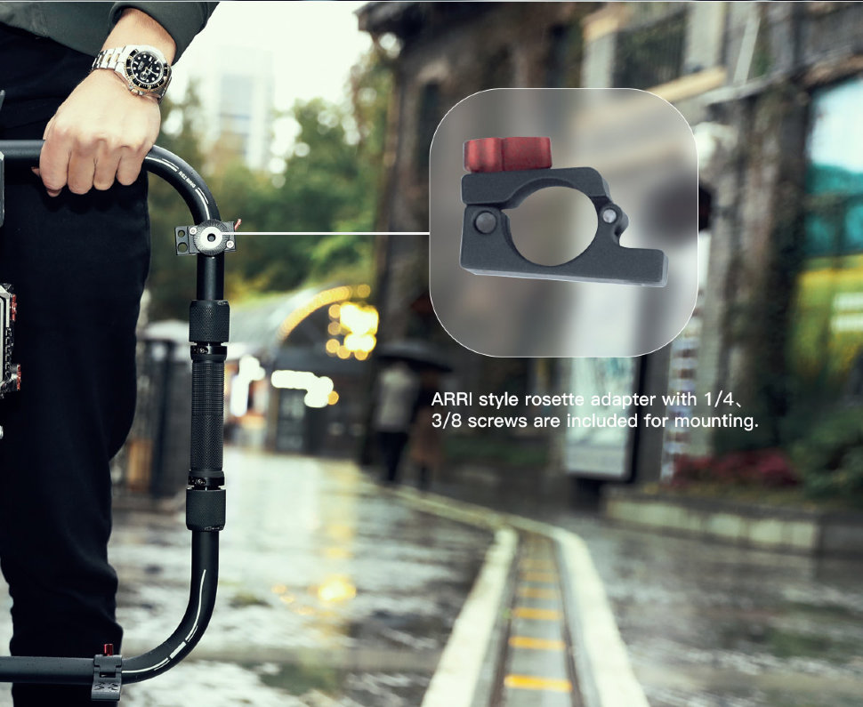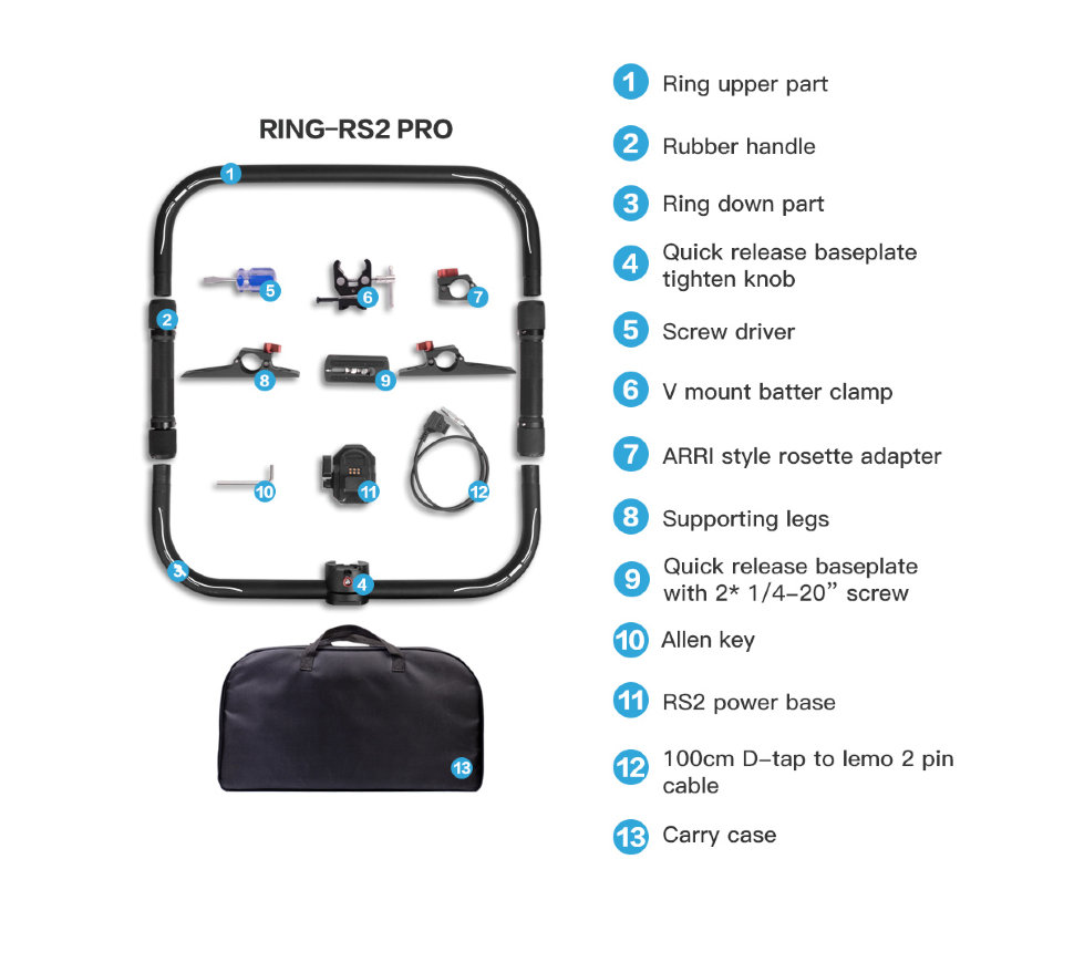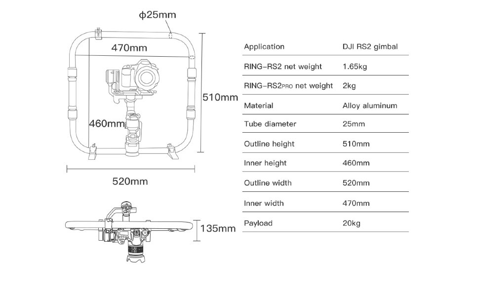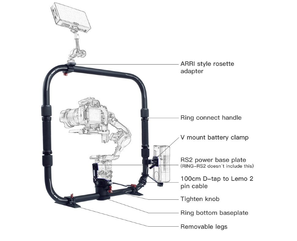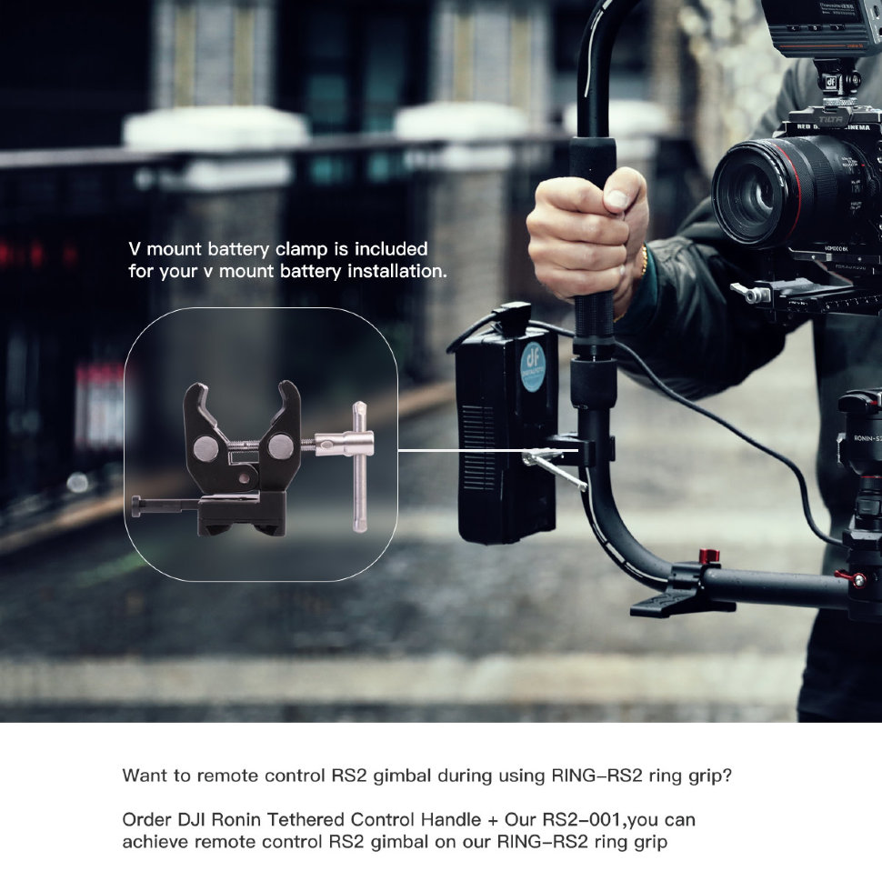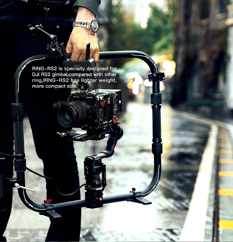 Кольцевой хват для работы со стабилизатором DJI RS2. Прочная конструкция из алюминия выдерживает нагрузку до 20 кг. Сама рама имеет диаметр 25мм, а благодаря креплениям в комплекте появляется возможность установить дополнительное оснащение на любом участке хвата |