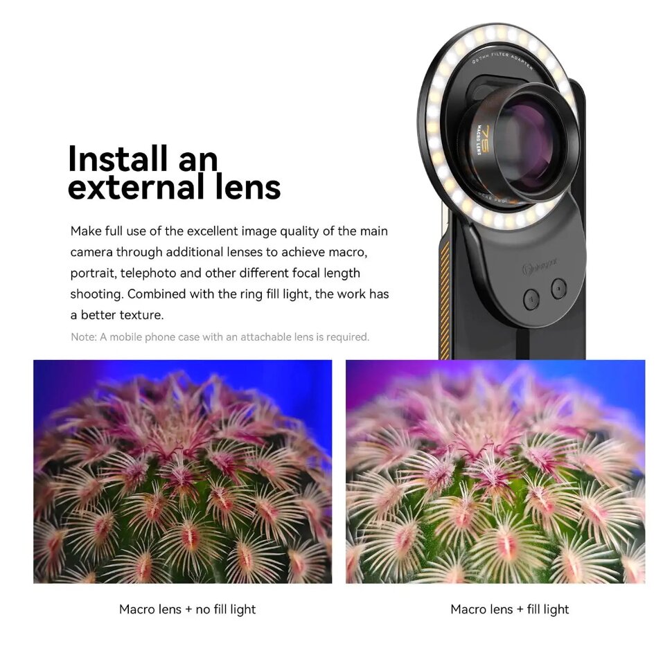 Миниатюрная кольцевая лампа для смартфонаFotorgear GH06 – это компактный кольцевой осветитель, предназначенный для улучшения качества фото и видеосъемки на смартфон. Магнитное крепление MagSafe обеспечивает надежную фиксацию на гаджете, позволяя устройству легко размещаться вокруг камеры для равномерного освещения. Благодаря своему компактному размеру и легкому весу, его можно брать всюду с собой, что делает его идеальным выбором для блогеров, фотографов и видеографов, которым важно всегда иметь под рукой качественный источник света, к тому же она не мешает использованию мобильной оптики и подойдет для светофильтра до 67мм |