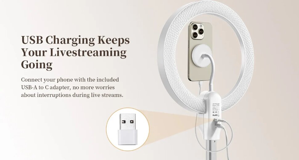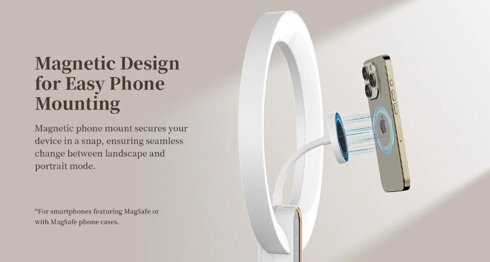 Магнитное крепление без зажимовОсветитель имеет магнитное крепление, совместимое со смартфонами с MagSafe. Такой способ установки позволяет очень быстро размещать и снимать телефон с осветителя, а также не перекрывать вход питания смартфона. Просто подключите кабель зарядки к комплектуемому USB-адаптеру и снимайте без прерываний! |