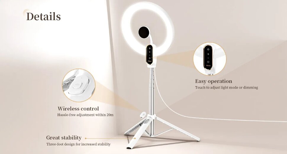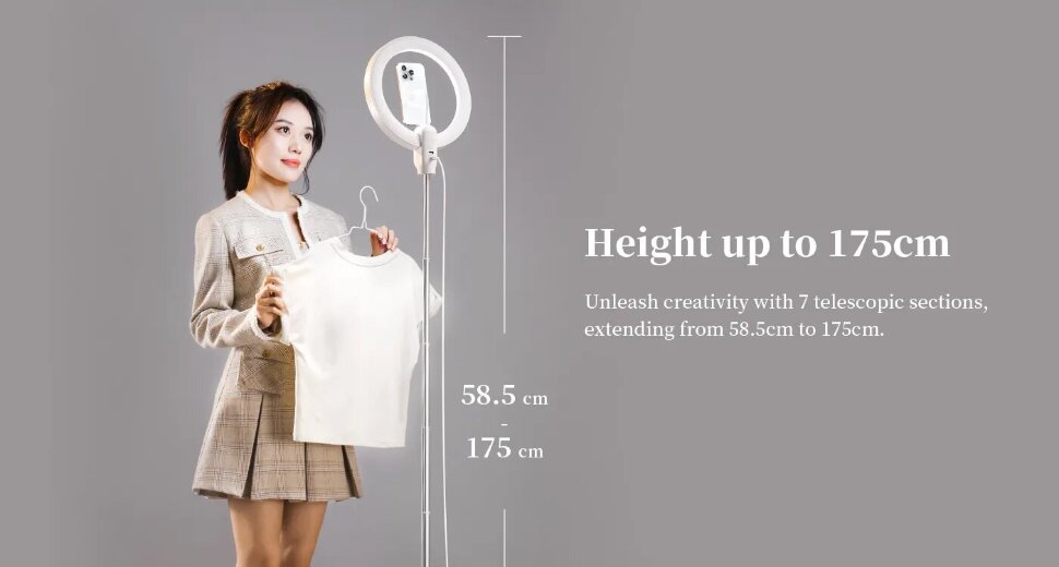 Направь как удобноВ комплект добавлена специальная стойка, которую можно использовать как настольную треногу или раздвинуть целых 7 секций до максимальной высоты в 175 см, что поможет для съёмки в полный рост. Универсальный вариант для предметной съёмки, ведения блога или проведения трансляций |