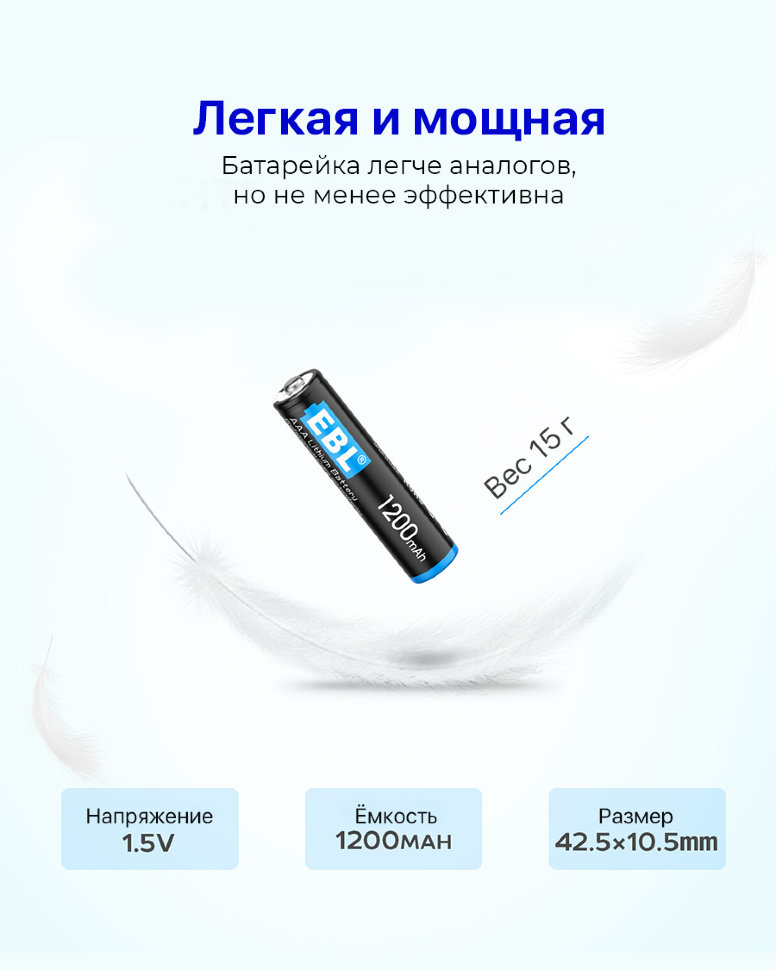 Низкий саморазрядЭлементы питания изготовлены по современным стандартам и имеют чрезвычайно низкий саморазряд. Потери составят менее 3% за месяц, но при этом энергоэффективность практически не снижается, что разительно отличает EBL от аналогов |