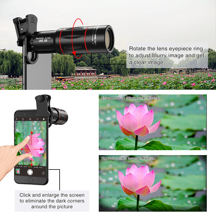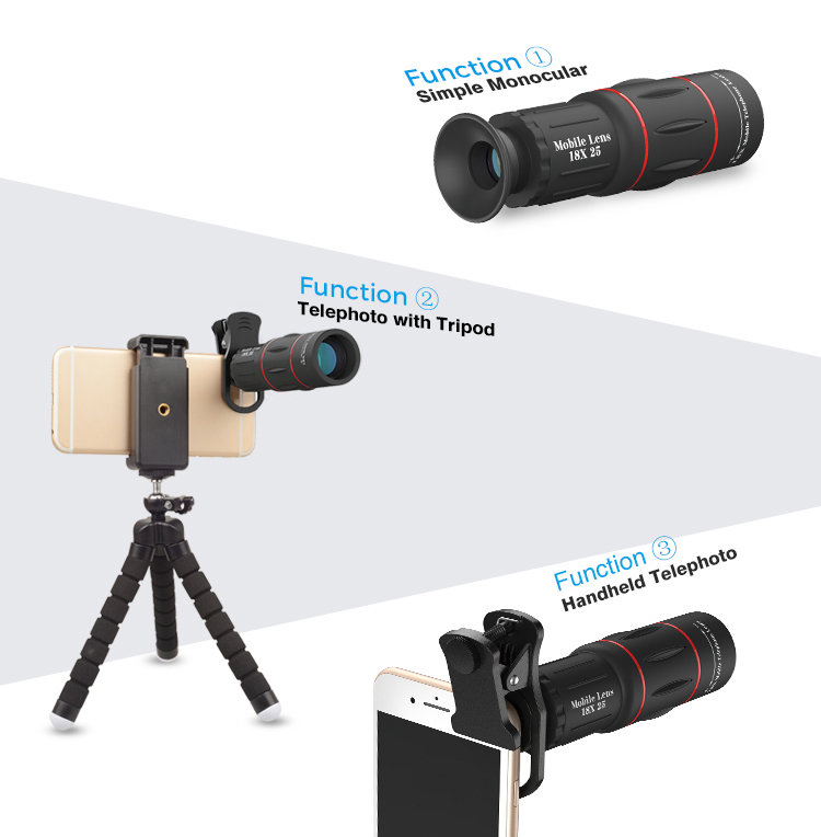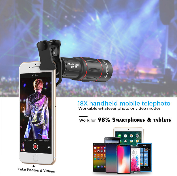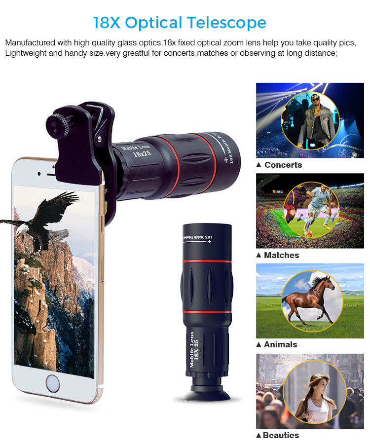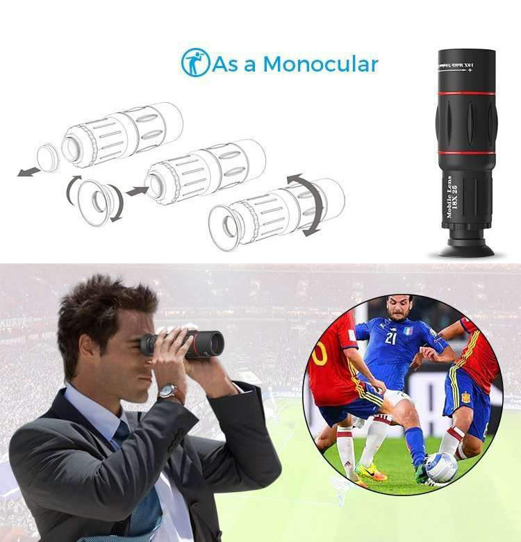 TELE 18XНастоящий мобильный телескоп с увеличением 18x. Снимайте объекты на дальнем расстоянии! Отлично подходит для запечатления диких зверей и птиц. При помощи специальной насадки его можно превратить в монокуляр и смотреть вдаль как через подзорную трубу |