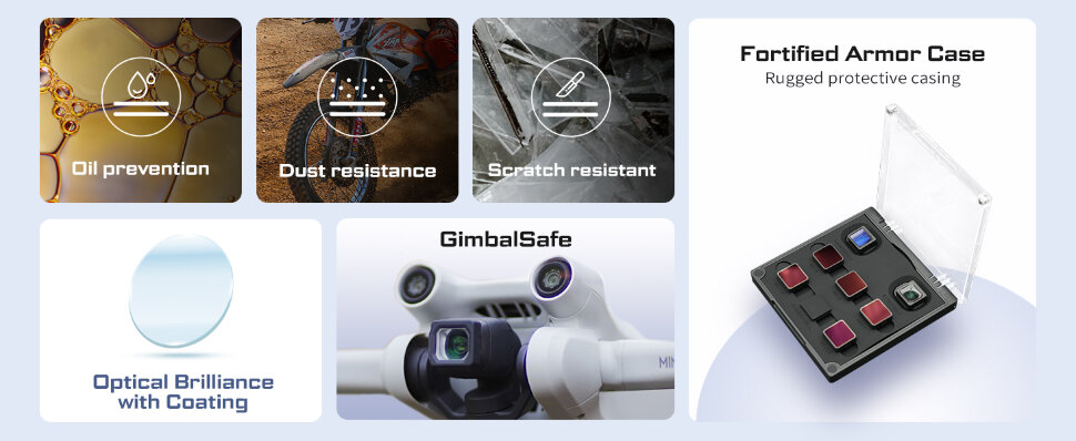 Точный контроль экспозиции и совместимостьНабор ND-фильтров (ND16, ND32, ND64, ND128, ND256) обеспечивает снижение светового потока на 4, 5, 6, 7 и 8 ступеней экспозиции соответственно. Это позволяет сохранять оптимальные настройки выдержки и диафрагмы даже при самом ярком солнечном свете, устраняя пересветы и обеспечивая плавное движение. Для сохранения стабильной работы подвеса (gimbal) критически важно включать дрон DJI Mini 4 Pro перед установкой любого фильтра или линзы на объектив. Все оптические элементы комплекта отличаются минимальным весом (по 2.5 грамма каждая линза), что практически не влияет на летные характеристики дрона |