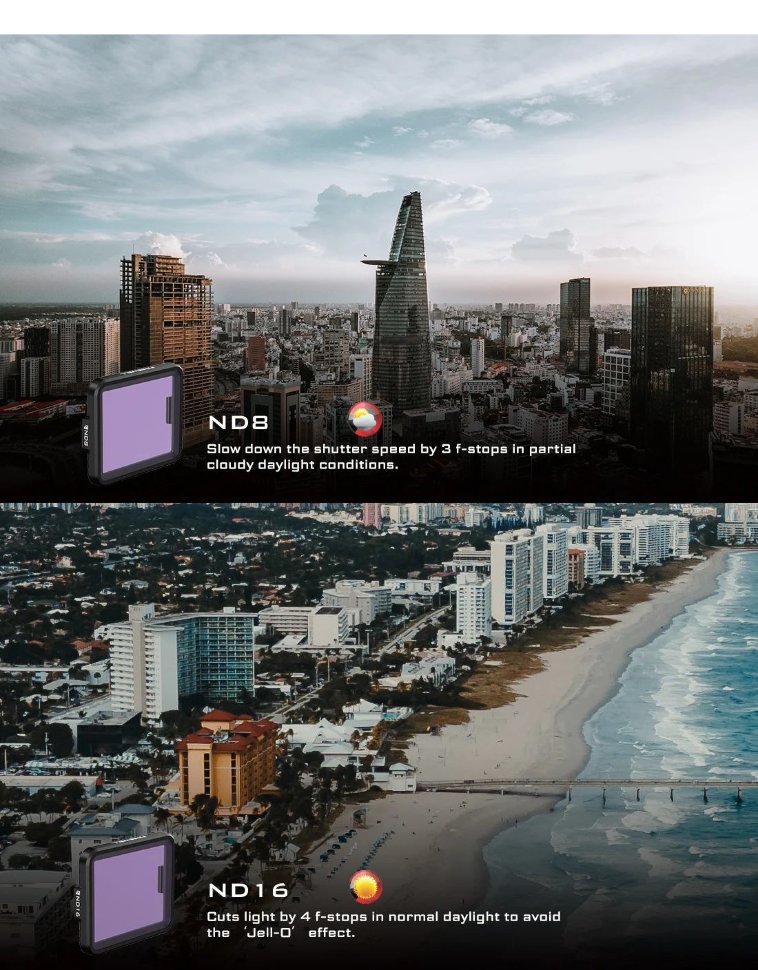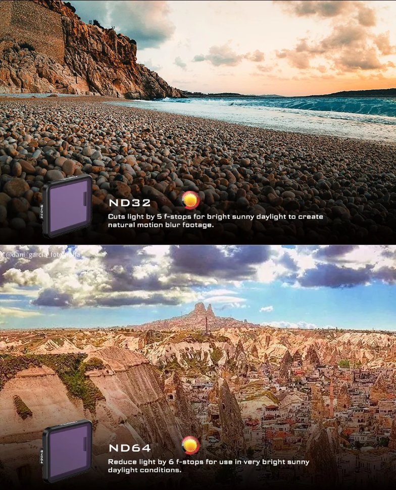 Входящий в комплект фильтр ND8 предназначен для съемок при дневном свете при частичной облачности. ND16 для съемки во время обычного дневного света. ND32 подойдет для проведения съемок при ярком солнечном дневном свете, а ND64 при очень ярком солнечном свете |