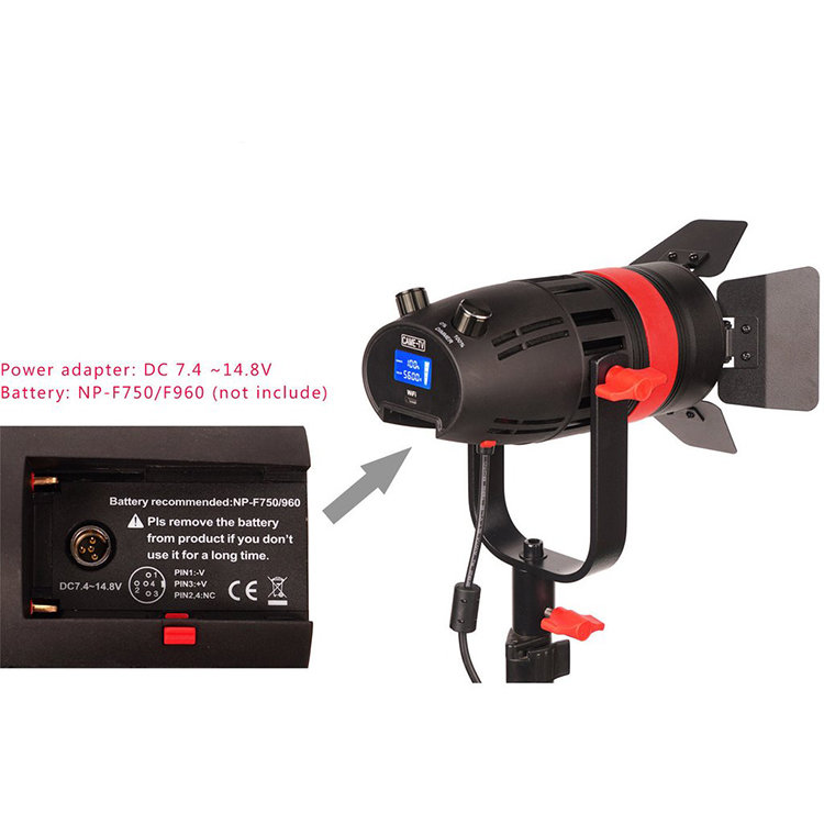 | Прожектор может быть подключен непосредственно к сети при помощи сетевого адаптера, либо питаться от батареи типа NP-F или V-Mount |