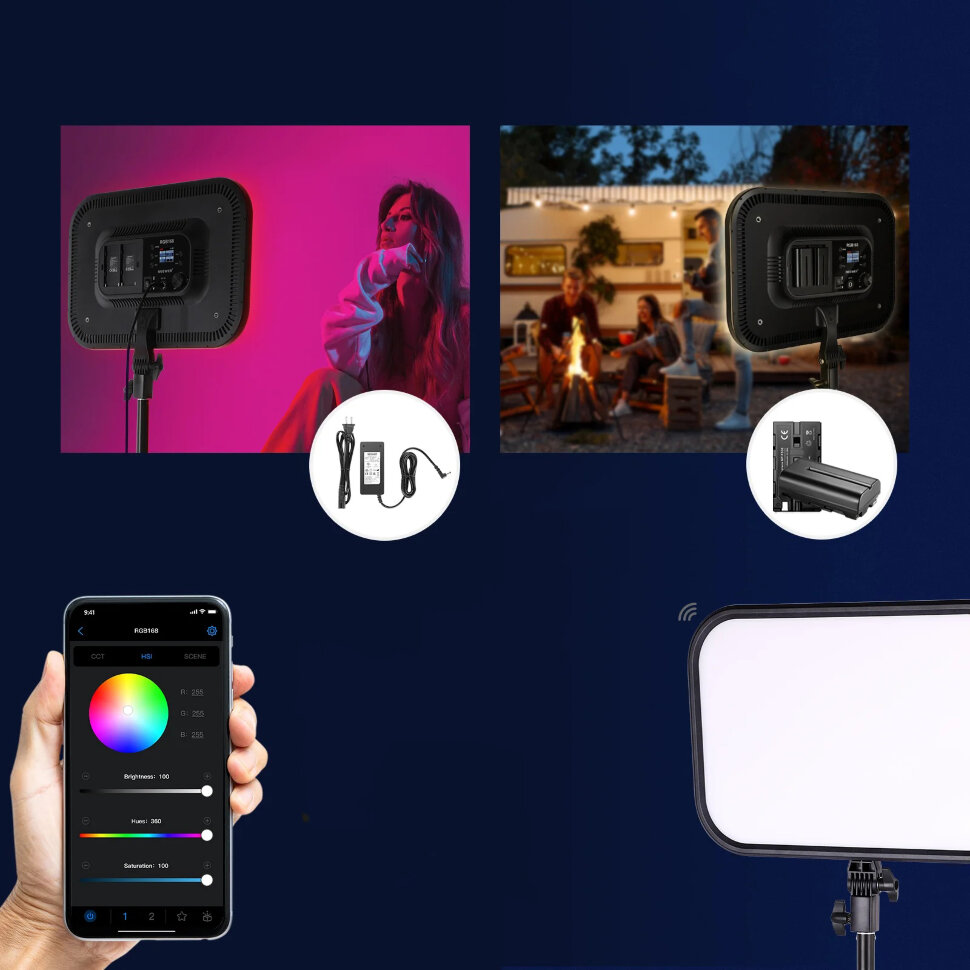 Готовый комплект RGB освещенияПолноцветная RGB панель с выходной мощность 60 Вт поможет сделать ваш контент разнообразным и актуальным. Высокий индекс цветопередачи 97+ и TLCI 97+ гарантирует точную цветопередачу на площадке. Оттенок цвета регулируется в диапазоне от 0 до 360°, яркость — от 0 до 100%, а цветовая температура варьируется в широком диапазоне 2500 — 8500 K |