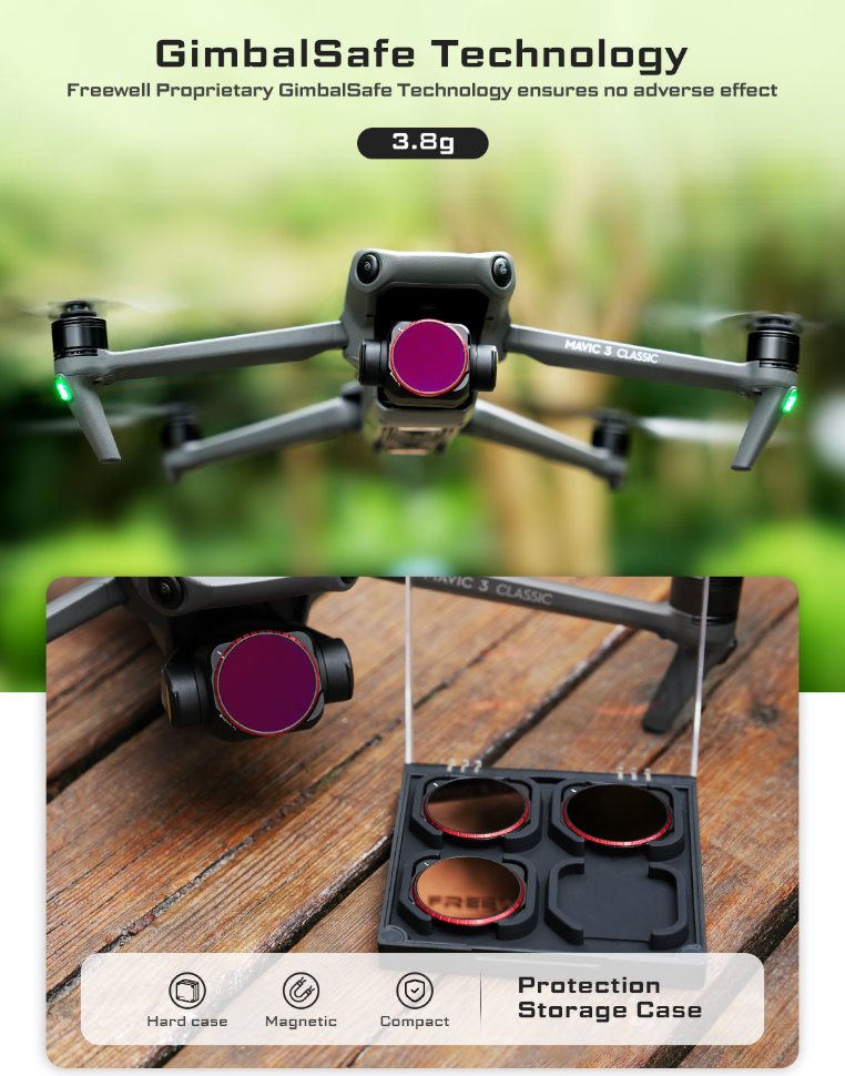 Комплект гибридных светофильтров для камеры дрона DJI Mavic 3 Classic изготовлен из немецкого оптического стекла. Линза устойчива к пыли и царапинам, а вес всего в 5.5г не перегружает подвес |