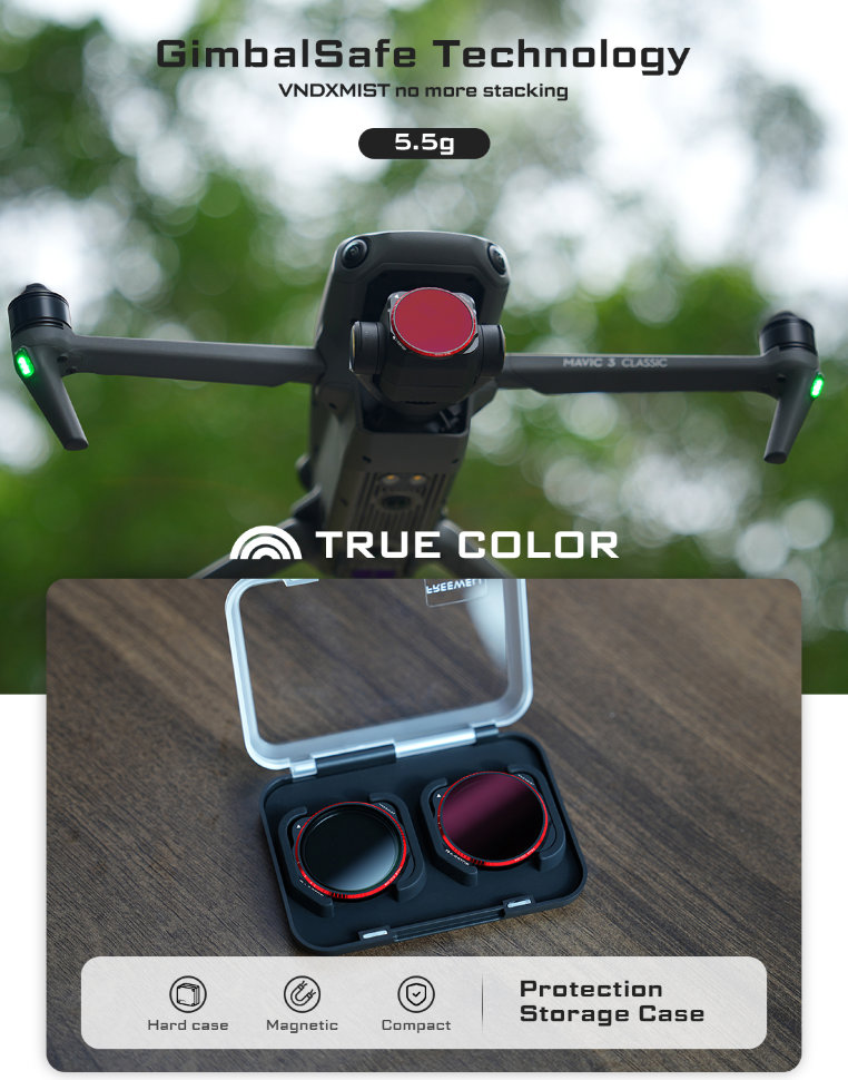 Комплект из двух регулируемых ND светофильтров для камеры дрона DJI Mavic 3 Classic изготовлен из немецкого оптического стекла. Линза устойчива к пыли и царапинам, а вес всего в 5.5г не перегружает подвес |