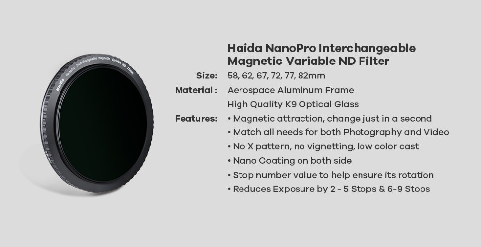 | Комплект из двух регулируемых ND фильтров на 2-5 Stop и 6-9 Stop с магнитным креплением. С помощью комплекта вы сможете быстро подобрать степень затемнения и подготовиться к работе |