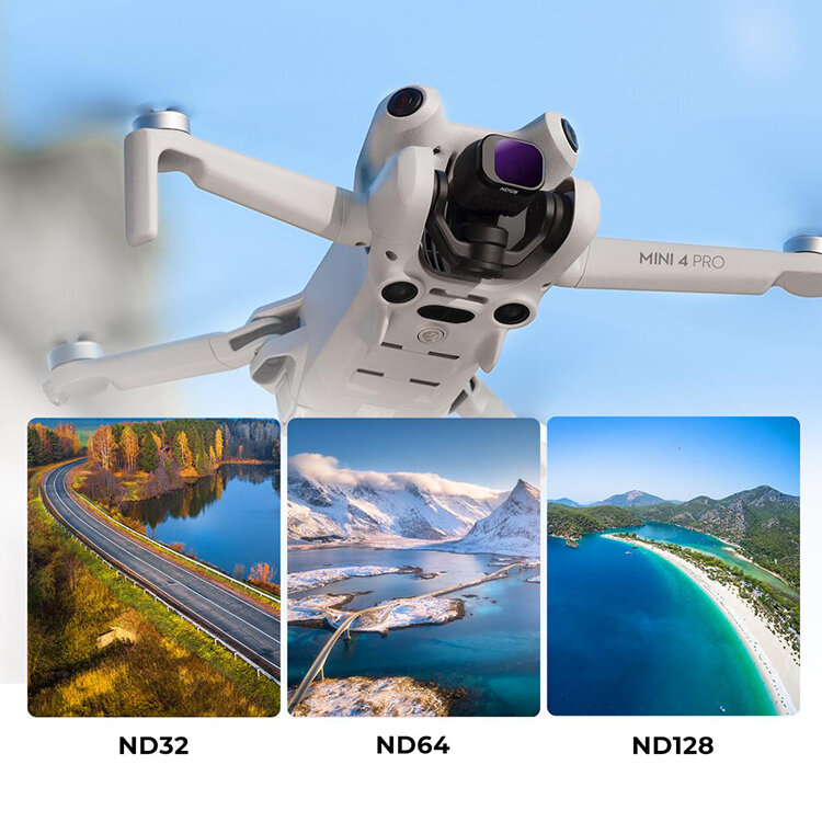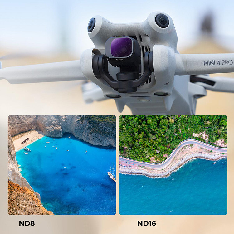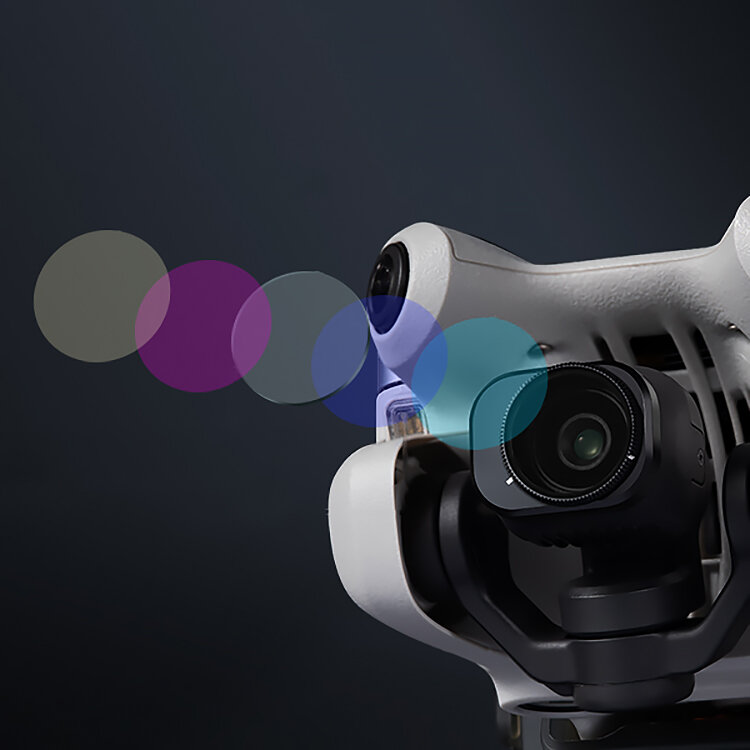 Комплект светофильтров для DJI Mini 4 Pro включает в себя пять фиксированных ND и один CPL. С помощью нейтральных фильтров можно уменьшить экспозицию и снимать с нужными настройками выдержки, а поляризационный уберет лишние блики и отражения |