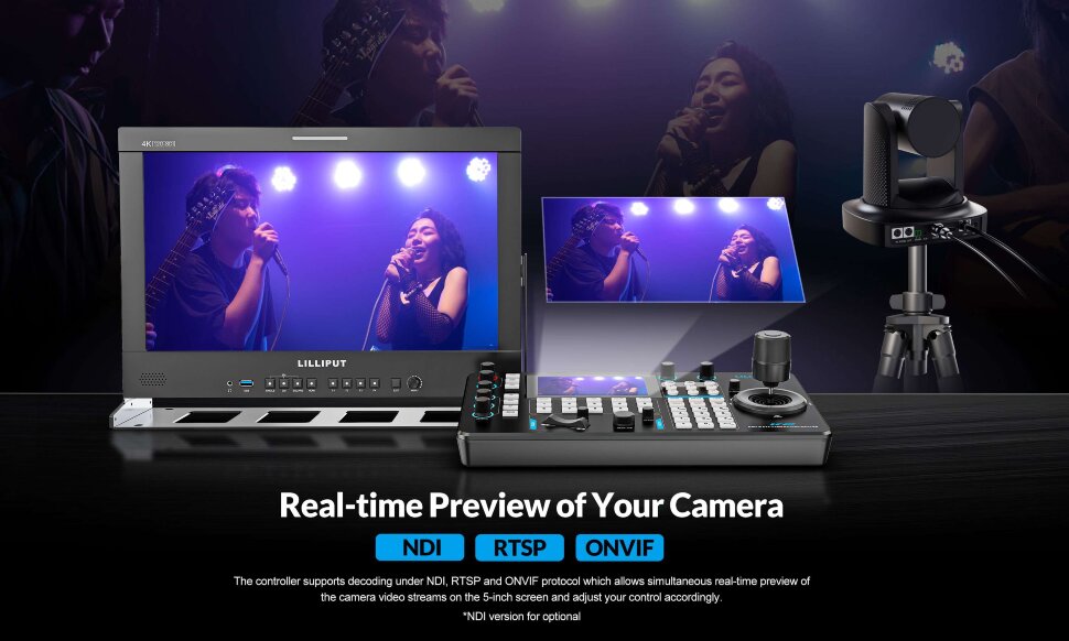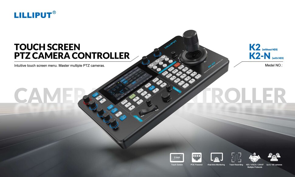 Удобный контроль за вдижением камерыКонтроллер Lilliput K22 с 5-дюймовым сенсорным экраном для управления PTZ-камерами. Модель поддерживает широкий ряд протоколов управления, включая VISCA, ONVIF и Pelco-P/D. Кроме того, Lilliput K2 легко синхронизируется с видеомикшерами через IP, RS-232, RS-422 и RS-485 интерфейсы, что позволяет использовать устройство с профессиональным оборудованием |