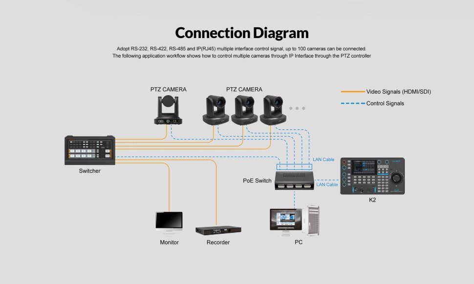 | Подключение | LAN, RJ45, RS-232, RS-485/422, Tally, USB 2.0 |