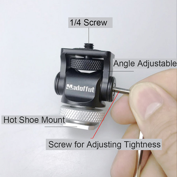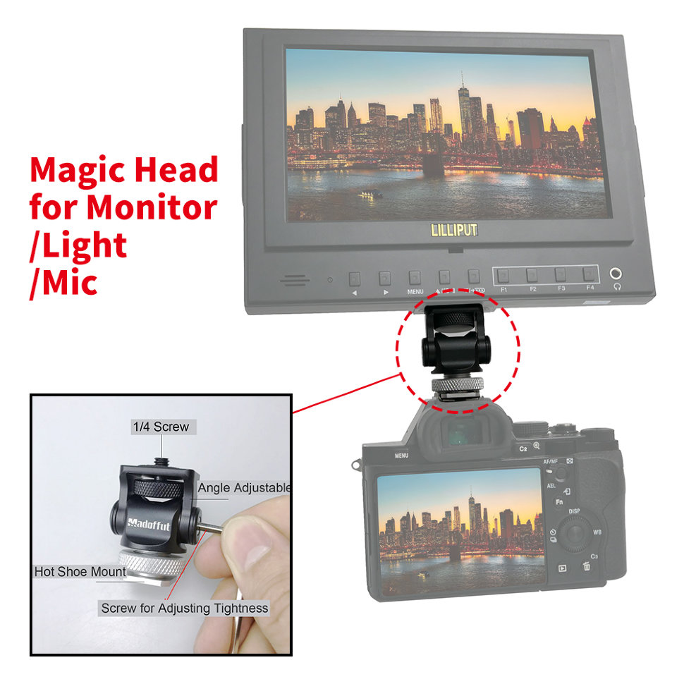 | Профессиональное крепление типа Magic Head 1/4" позволяет установить дополнительное оборудование под любым углом на холодный башмак камеры или иную конструкцию для съёмки |