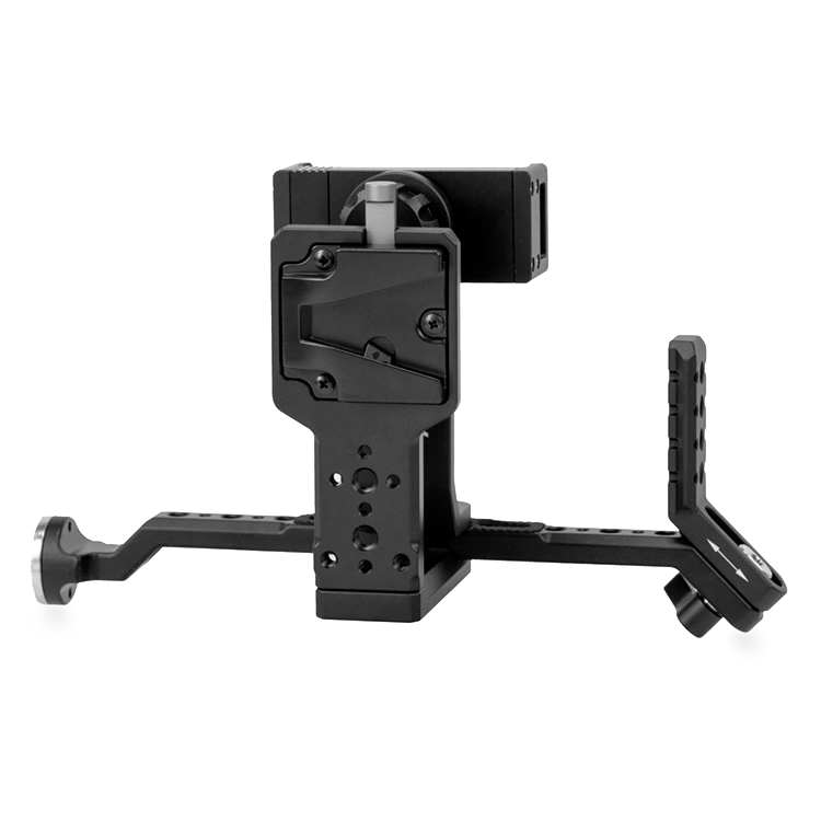 Кронштейн оснащен адаптером V Mount для установки аккумуляторной батареи. Предусмотрены резьбовые отверстия 1/4" для установки дополнительных аксессуаров. Кронштейн изготовлен из прочного алюминиевого сплава, способен выдерживать повышенные нагрузки  |