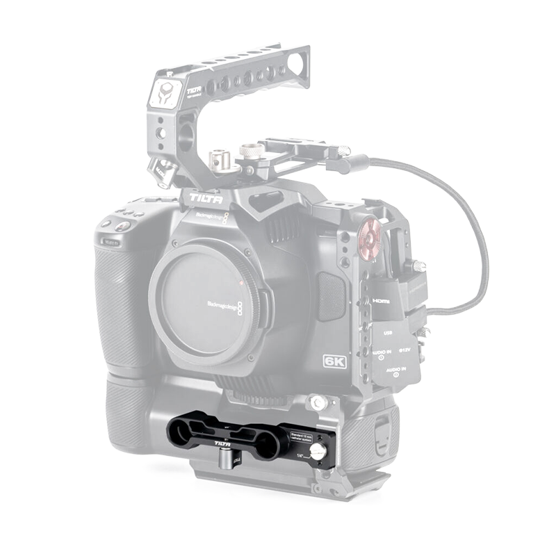Держатель 15мм направляющих, разработанный для клеток камеры BMPCC 6K Pro от Tilta. Благодаря ему появляется возможность установить компендиум или мотор follow focus в близости от объектива, что будет удобно при использовании батарейного блока  |
