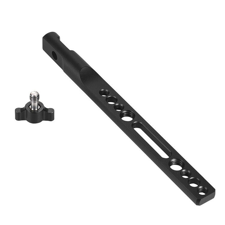 Кронштейн для установки съёмочного оборудования. Модель имеет винт 1/4" для закрепления на стабилизаторе или ином профессиональном оснащении. Наличие отверстий 1/4" и 3/8" позволяет дополнить конструкцию поставив держатели, микрофон, осветитель или другую аппаратуру |