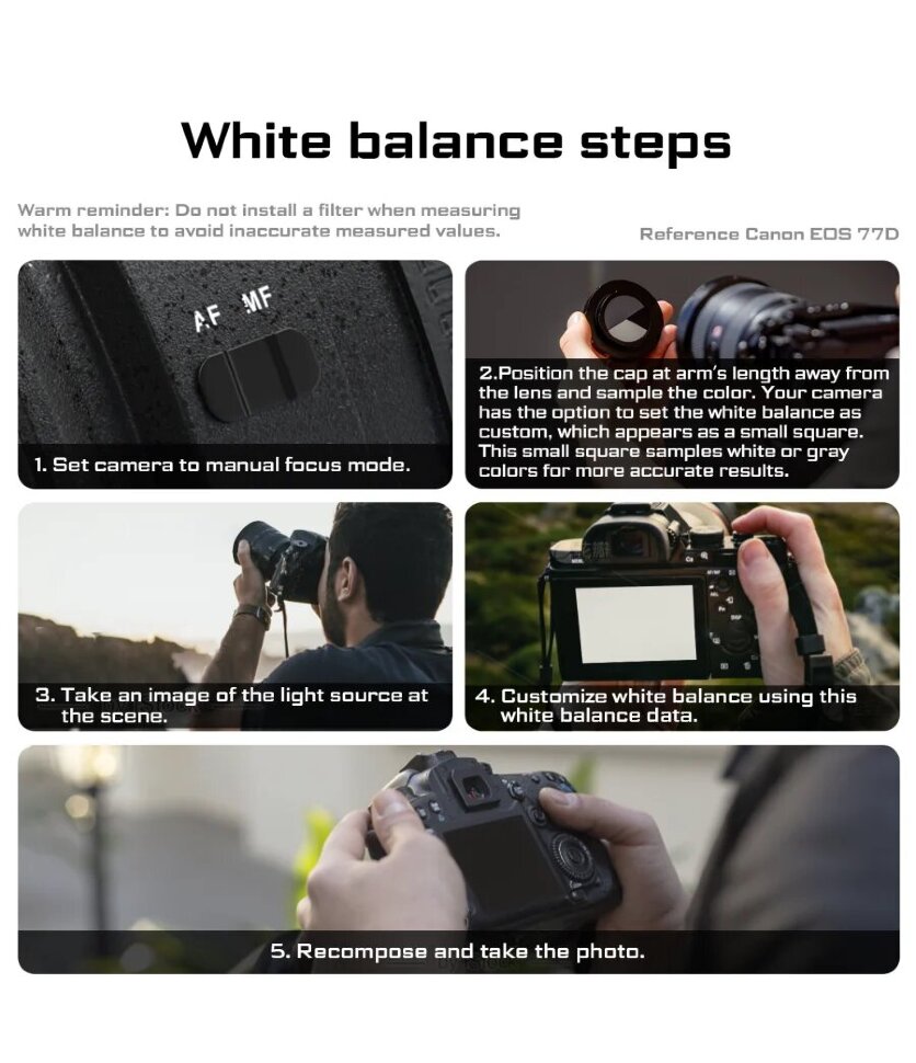 Полная адаптация к условиям съемкиКарта для калибровки баланса, которую можно просто надеть на байонет камеры. На ней помещены белый, черный и серый цвет. Такой подход позволяет добиться корректной настройки цветовых значений, обеспечивая точную цветопередачу на всех снимках. Это позволяет пользователю мгновенно адаптировать баланс белого к текущим условиям освещения. Компактный и легкий дизайн делает инструмент удобным для постоянного использования в полевых условиях, позволяя легко транспортировать его в сумке для фотокамеры