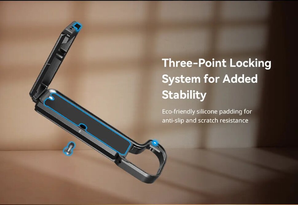 Комплект дополнен съёмным адаптером холодного башмака, а также зажимом кабеля предотвращающим случайное отключение. При помощи резьбовых отверстий 1/4" площадку можно оснастить дополнительными приспособлениями |