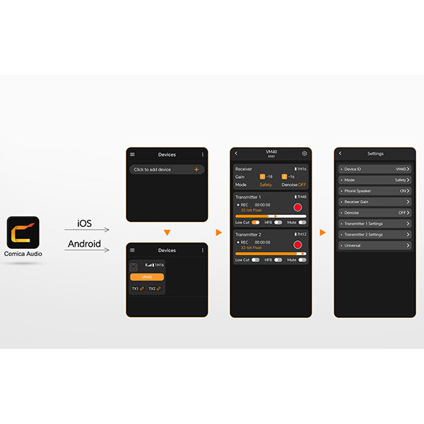 Управление через приложениеПриложение Comica Audio, доступное для iOS и Android, позволяет управлять радиосистемой через Bluetooth на смартфоне. С его помощью вы сможете дистанционно следить за состоянием микрофона, изменять настройки и управлять несколькими устройствами |