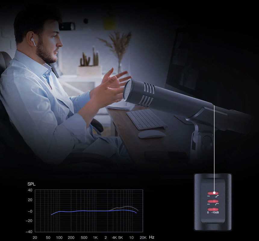 Обладая профессиональными функциями, необходимыми для качественной записи, такими как частотная характеристика, усиление высоких частот, затухание и фильтр верхних частот, микрофон SYNCO V10 невероятно универсален и хорошо подходит для различных применений. Позолоченная диафрагма обладает высокой чувствительностью к музыкальным и вокальным звукам, обеспечивая качество звука без потерь |