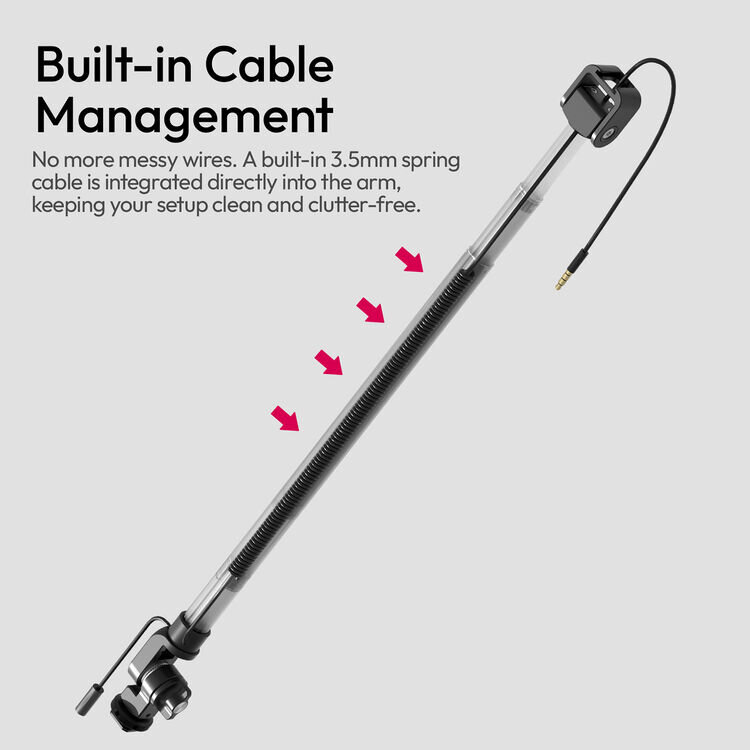 Встроенный кабель и гибкая система крепленияВажной особенностью модели является встроенный коаксиальный кабель с разъёмом mini jack 3.5 мм, который надежно передает аудиосигнал, устраняя необходимость во внешних проводах и снижая риск создания помех. Два регулируемых шарнира с возможностью настройки до 180° каждый позволяют точно направлять микрофон. Один из шарниров оснащен холодным башмаком для крепления аксессуаров, а второй — устойчивым основанием для фиксации на стойке |