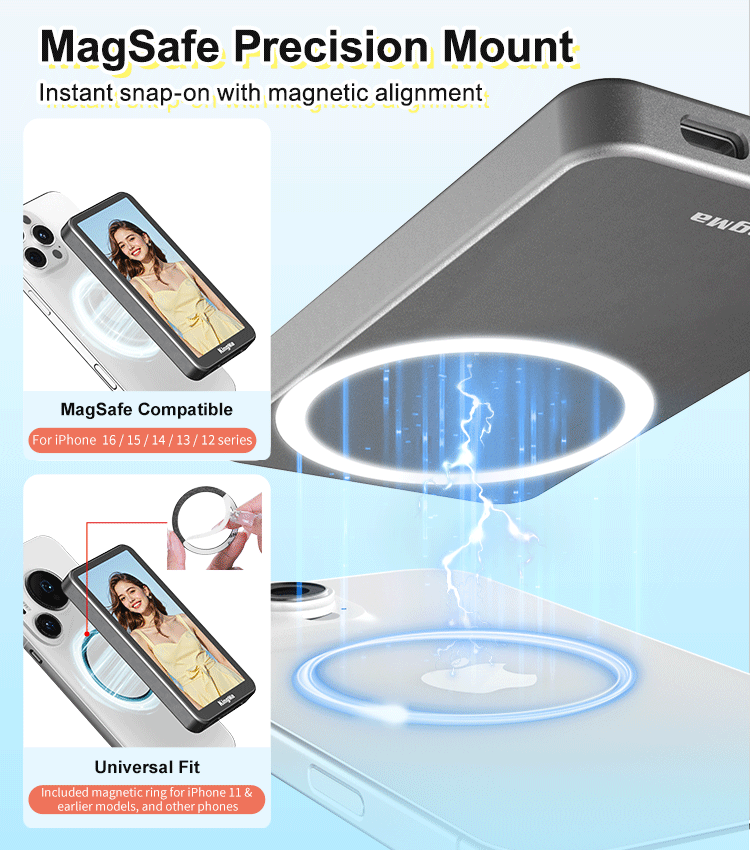 Ultra удобноМонитор для селфи PH02 Ultra оснащен системой MagSafe, обеспечивающей мгновенную фиксацию на смартфоне с магнинтым кольцом без усилий и дополнительных креплений. 4" дисплей разрешением 960×240 пикселей и бесшовной рамкой передает изображение в реальном масштабе 1:1, устраняя обрезание обзора предыдущих моделей. Автоповорот экрана между портретной и ландшафтной ориентацией происходит всего за 0.3 секунды |