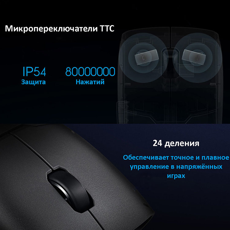 Корпус мыши специально спроектирован для максимально удобного совершения быстрых и ловких действий в игре, а эргономичная форма обеспечивает удобную посадку ладони. Устройство оснащено пыленепроницаемыми позолоченными микропереключателями TTC со сроком службы 80 миллионов нажатий и соответствует степени защиты IP54 |