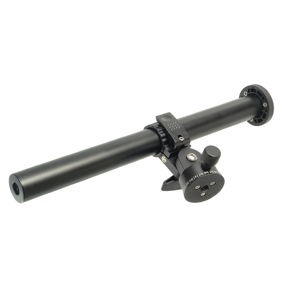 Наклонная колонна для съёмки с необычного ракурса и работы с макро. Подвижное основание дает возможность изменять положение штанги по вертикали от -90˚ до 90˚ с поворотом на полные 360. На кронштейне штанги расположены пузырьковые уровни для удобства работы. Безлюфтовая конструкция с жидкостным демпфированием и шкалой отсчета по оси панорамирования надежно фиксирует камеру в любом положении |