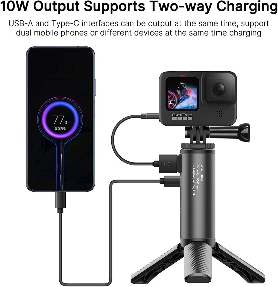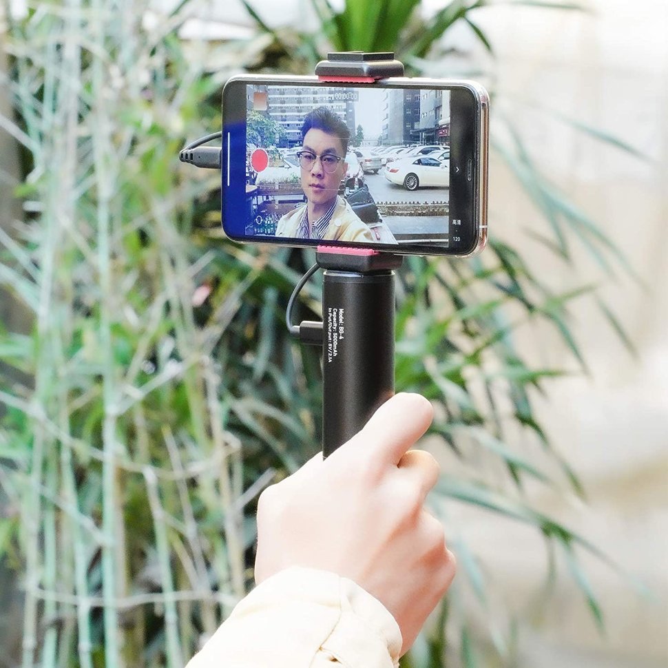 Рукоятка со встроенным в корпус аккумулятором на 5000 мАч для подзарядки установленного оборудования. Имеет выход USB для подключения соответствующего кабеля. В нижней части ножки раскладываются, что превращает устройство в настольный штатив |