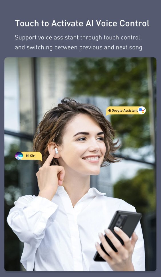 Удобное управлениеБеспроводные наушники автоматически включаются, когда вы вынимаете из зарядной станции и выключаются, когда вы кладете их обратно в бокс. Ключевой особенностью представленного аксессуара является наличие специальной кнопки, благодаря которой можно вызвать голосового помощника |
