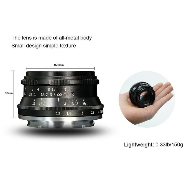 Мануальный фотообъектив, предназначенный для работы с беззеркальными камерами Fuji (APS-C), с креплением X Mount. Изделие имеет компактные габаритные размеры и небольшой вес, что вкупе с устойчивостью к незначительным ударам, и падениям с небольшой высоты, позволяет часто брать объектив с собой. Фото аксессуар используется для съемки при разном освещении, позволяет получить яркие, контрастные и четкие снимки. Идеально подходит как для ведения портретной съемки, так и создания фото общего плана |