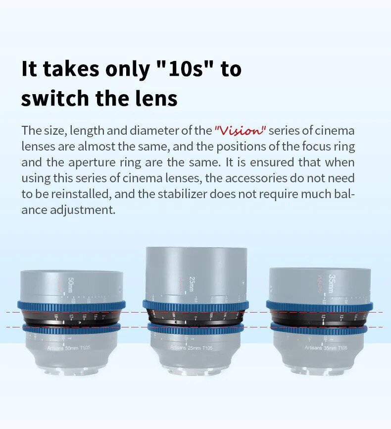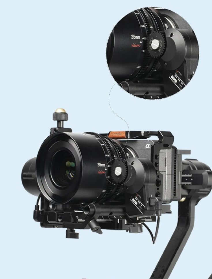 VisionКоллекция кинооптики серии Vision просчитана для удобной работы. Зубчатые кольца 0.8 mod регулировки фокуса и диафрагмы у каждой модели находятся на одном расстоянии, благодаря чему нет необходимости менять расположение привода follow focus при смене оптики из этой линейки |