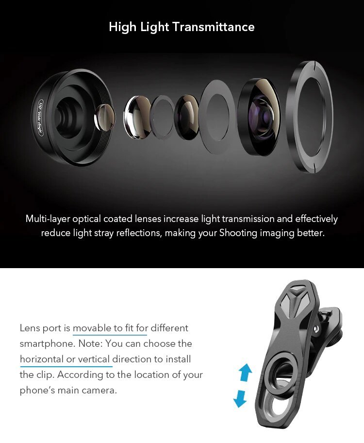 110°Высококачественный широкоугольный объектив для смартфона увеличит обзор камеры на 110°. Модель подойдет для съёмки в 4K HD пейзажей или крупных планов |