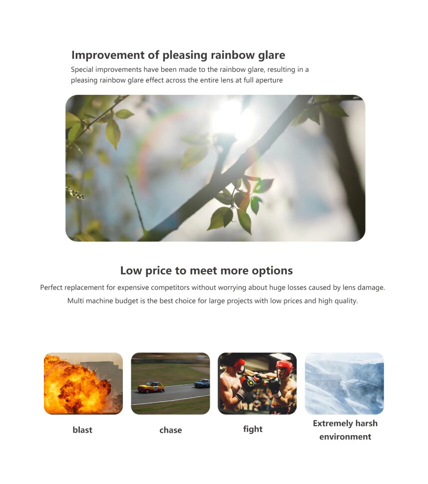 Винтажная кинооптикаVintage серия кинообъективов APO Mini Prime обладает специальным покрытием, которое сглаживает оттенки кожи и добавляет эффект ореола, характерный для винтажной оптики. При открытии диафрагмы создаётся эффект радуги, при закрытии — блики сводятся к минимуму, сохраняя резкий, но мягкий фокус. |