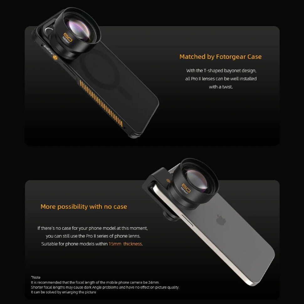 Удивляет качествомМобильная оптика Fotorgear серии Pro II выполнена из материалов гарантирующих надежность. Крепкий корпус выточен их алюминия, а оптическое стекло с мультипокрытием обеспечивает чёткую и ясную картинку. Для установки используется байонет T-mount от Moment, совместимый с соответствующими аксессуарами, в том числе чехлом или креплением от Fotorgear (приобретается отдельно). Отличительной особенность серии является возможность установить светофильтр при помощи адаптера (в комплект не входит) |