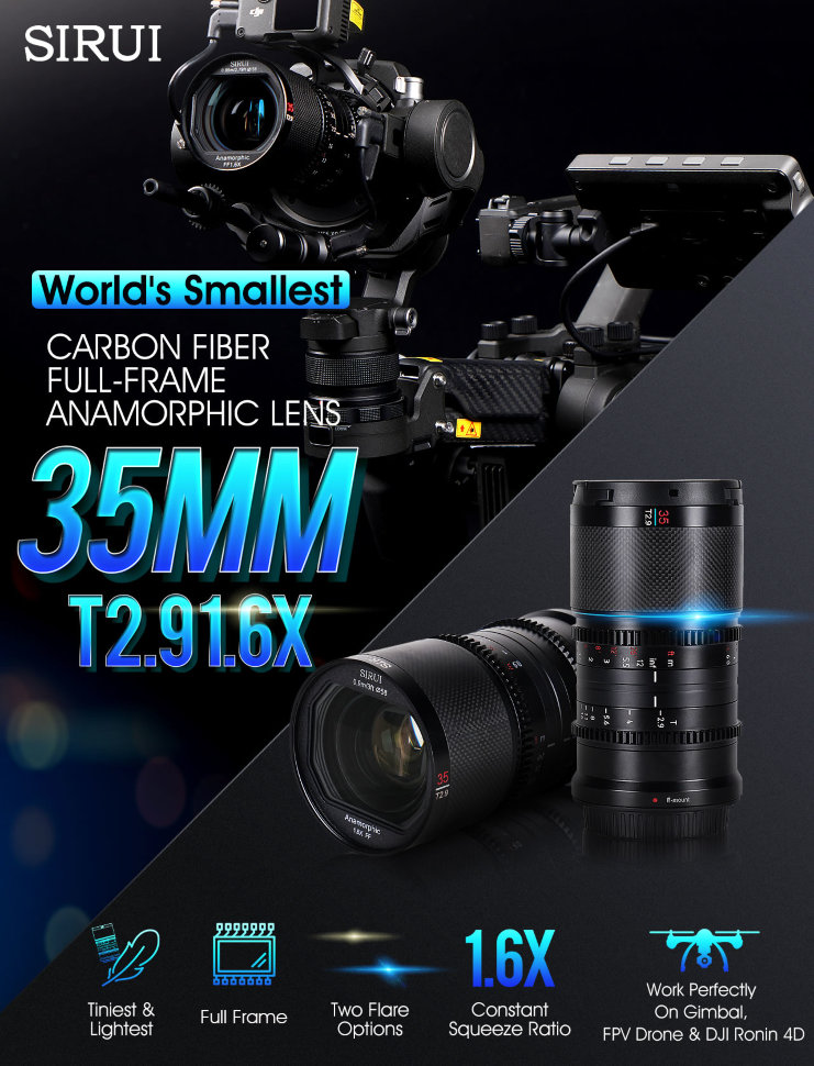 Самый лёгкий. Самый маленькийSaturn 35mm - это новинка в серии популярных и доступных объективов с анаморфированием. Корпус из карбона и оптимизированная конструкция позволили сделать самый компактный и лёгкий вес среди аналогов. Благодаря этому объектив отлично подходит для съёмки со стабилизатором или FPV дроном |
