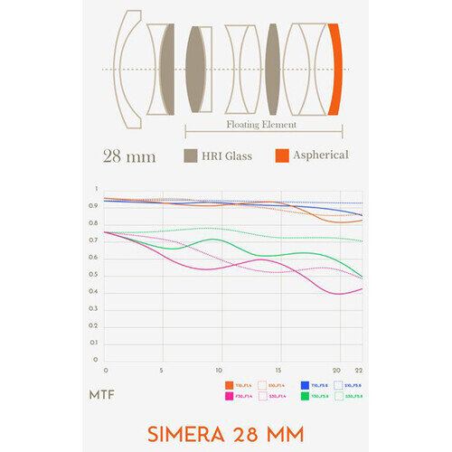 Высокая производительность и качество изображенияС конструкцией, включающей асферический элемент и три элемента с высоким показателем преломления, Simera минимизирует хроматические аберрации и улучшает общее качество изображения. Яркая диафрагма f/1.4 позволяет получать высококачественные снимки даже в условиях низкой освещенности. Объектив также оснащен 14-лопастной диафрагмой, создающей круглый боке, что особенно полезно для портретной съемки и при работе с близкими объектами на минимальном расстоянии 40см |