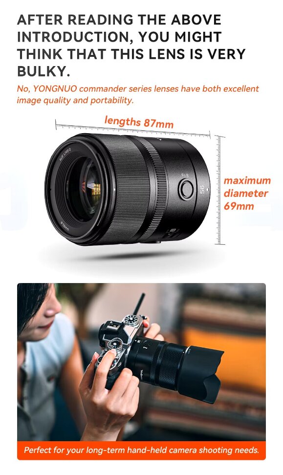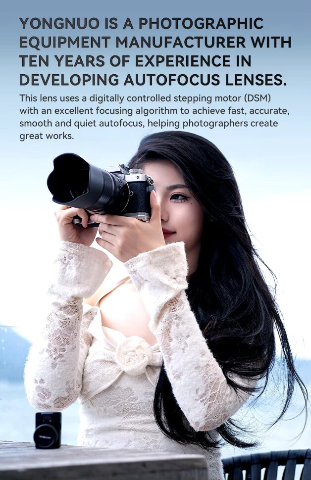 Новинка от Yongnuo удивляет. Компактный объектив на APS-C камеру весом всего 375 граммов, сочетает компактность и легкость, что делает его идеальным для повседневного использования. Быстрый DSM мотор отлично справляется с резкой сменой плана при минимальном дыхании фокуса. Главная фишка - возможность дистанционного управления посредством пульта BR-L1 (не входит в комплект) |