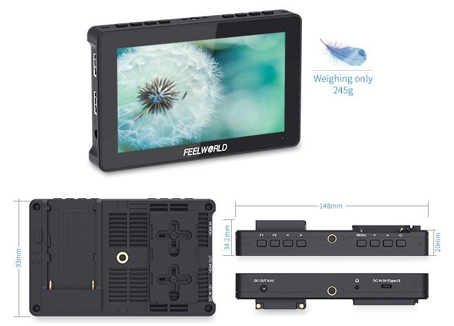 Улучшенная версия монитора F5 Pro с увеличенным до 5.5" экраном способен сделать съёмку более комфортной и продуктивной. Full HD IPS дисплей с разрешением 1920х1080 pi поможет более тщательно отслеживать фокус и настройки цвета. Устройство может быть подключено к более крупному экрану и транслировать видео в формате 4К |