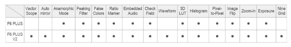 ФункциональностьМонитор имеет все необходимые для качественной работы и удобства оператора функции. Он способен отслеживать пиковую фокусировку, ложный цвет, экспозицию, сетку и имеет множество других параметров. В обновленной версии прибавилось еще несколько режимов, недоступных ранее, это: Waveform, Vector scope, Auto Mirror, Nine Grid и второй тип False Color |