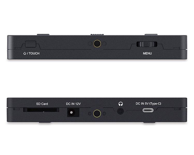 Ультратонкий корпусПри всей своей функциональности монитор имеет толщину всего лишь в 2 cм и массу 235 г, что делает его крайне удобным в использовании, особенно учитывая массивность конструкций профессионального оборудования. На верхнем торце расположились кнопки управления и колесико регулировки, на нижнем же входы/выходы HDMI, питание и разъём для наушников. Отверстие для стандартного крепления 1/4 дюйма есть с верхней, с нижней и с боковой стороны, что позволяет закрепить монитор в любом удобном положении |