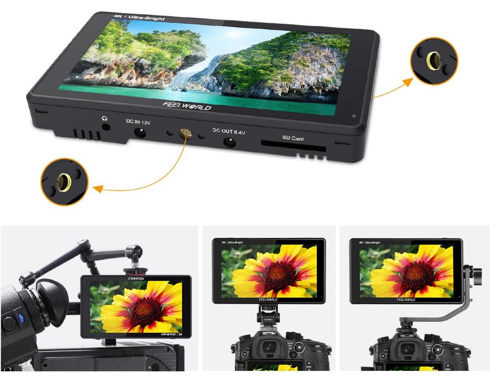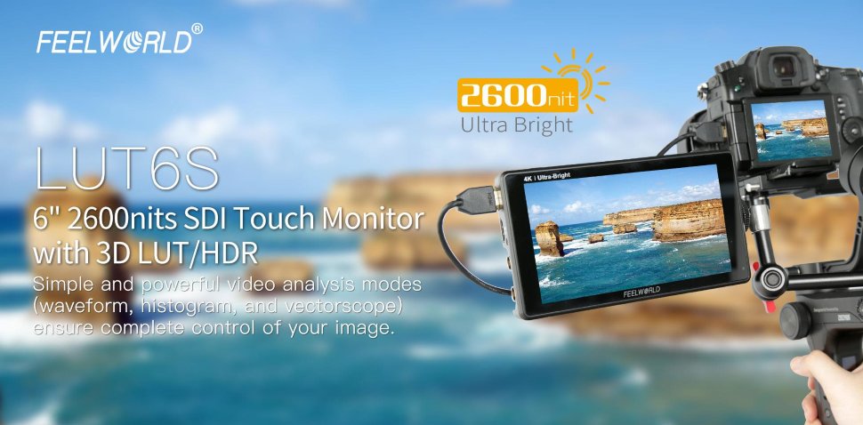 СуперяркийНовая модель монитора от Feelworld имеет яркость в целых 2600nit, что позволяет работать в условиях яркого солнцезащитного света без козырька. Легкий, но прочный LUT6 весит всего 300 г, и может быть установлен на камеру или систему риг при помощи кронштейна поставляемого в комплекте |