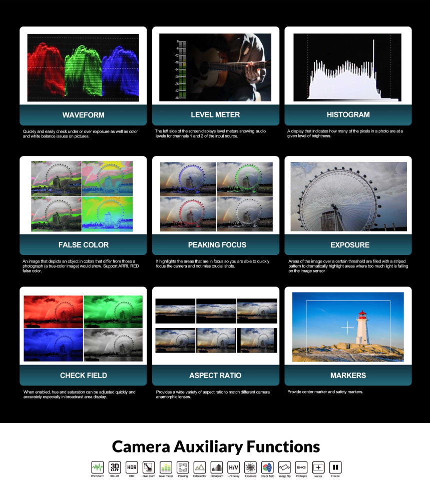 Еще больше возможностей для качественной работыОператорский монитор оснащен целым рядом дополнительных функций, с помощью которых пользователь сможет значительно расширить функционал собственных возможностей. Модель поддерживает работу с 3D-LUT для применения цветокоррекции в "прямом эфире", а также режим HDR |