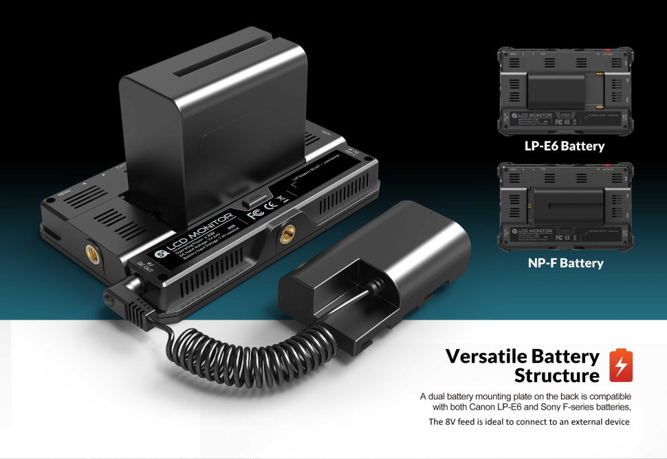 Встроенное крепление для батарейМонитор оснащен встроенным адаптером для наиболее популярных аккумуляторных батарей. Благодаря этому процесс съемки будет автономным и по-настоящему комфортным |
